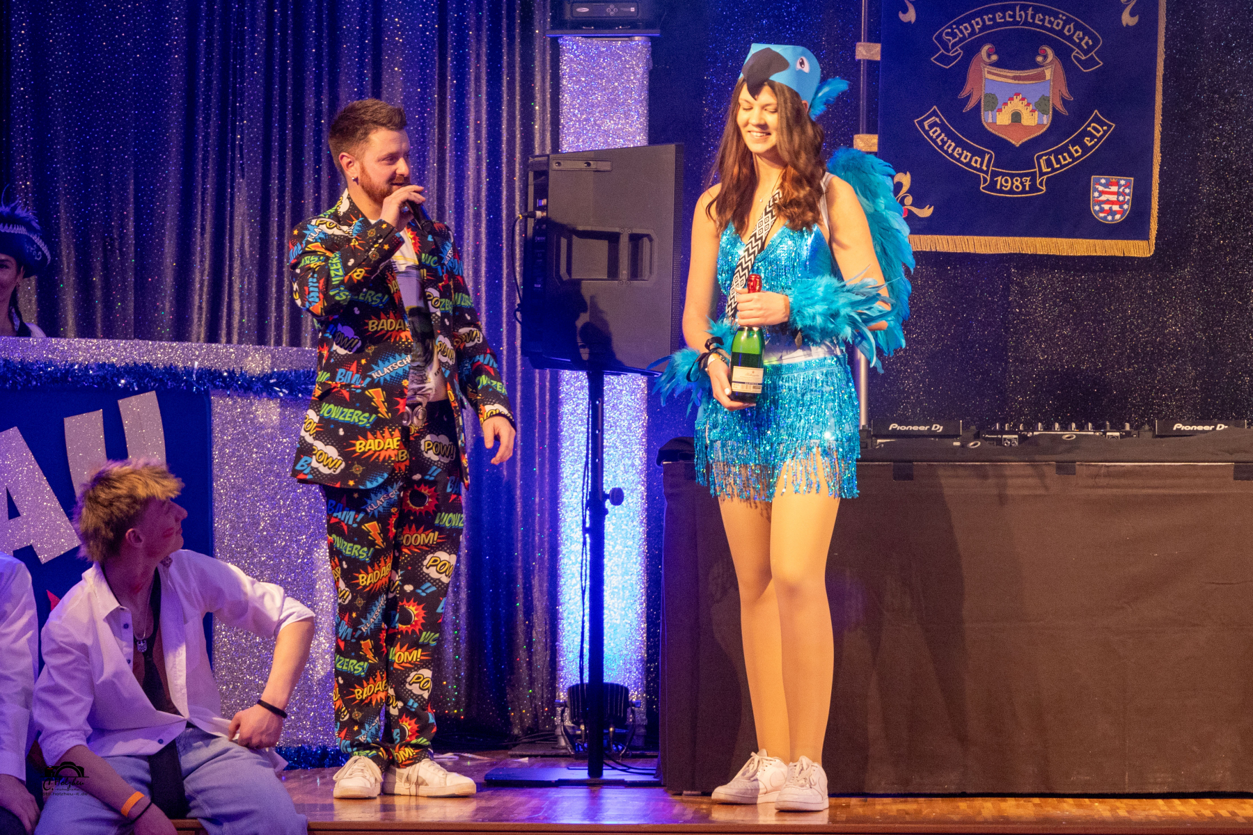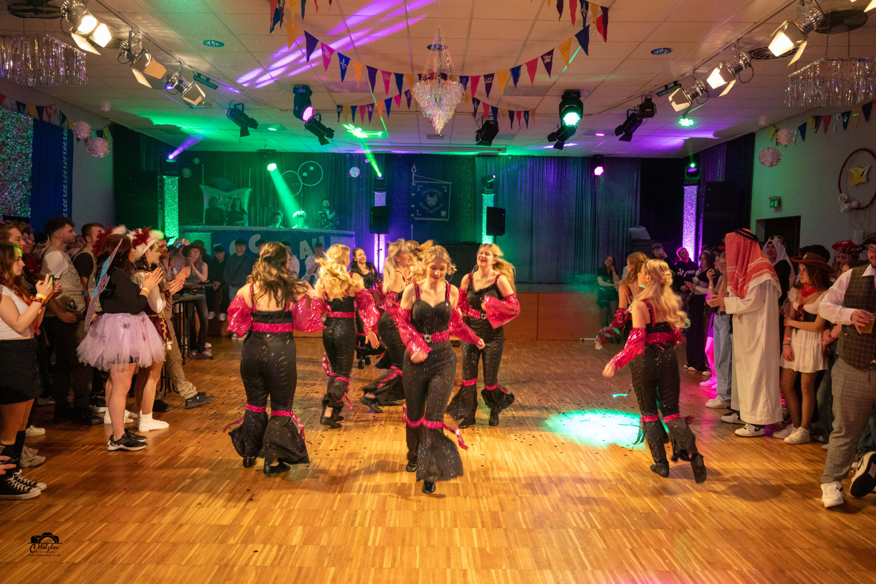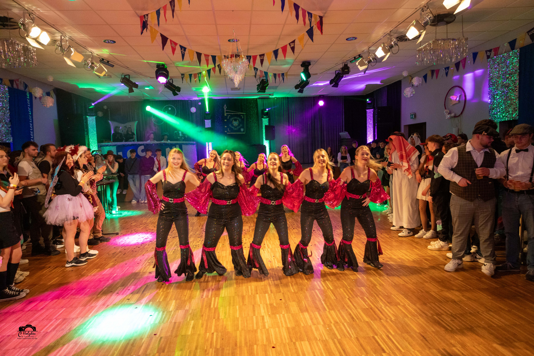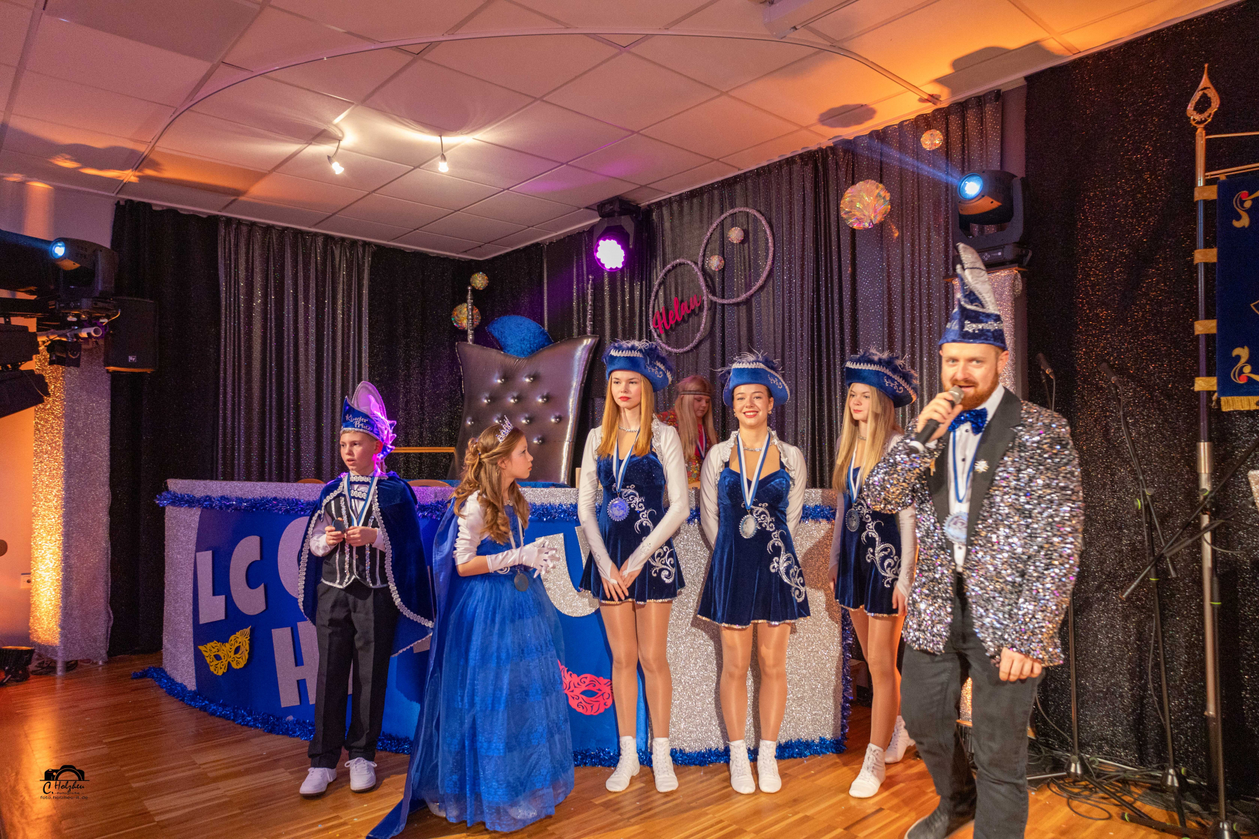 Zur Prinzenproklamation wurden sie im Saal herzlich begrüßt. Bevor der Prinz in die Bütt steigen konnte, gab es noch eine Premiere. Die Kinderfunken traten zum ersten Mal bei einer Abendveranstaltung auf. Dann kamen die großen Funken auf die Tanzfläche. Mit viel Schwung gaben sie wieder ihr Bestes. Mit dem Traditionslied der Brummisänger begann die „Show“. Die kleinen „Senoritas“ bezauberten das Publikum, ebenso das 15jährige Tanzmariechen Charlene Koch. Die heißen Nadeln stellten sich mit einem Medley vor. Marcello und Trucker Kalle (Jochen Ludwig und Jörg Kirchner) stiegen als erste in die Bütt. Die Chrazy Cherries als bezaubernde Dschiennie`s tanzten im Anschluss. Der Urlauber (Michael Gries) brachte gewitzt das närrische Volk zum Lachen. Akki und Bachi heizten mit dem Lied „Ramba Samba“ weiter das Publikum ein. Hausmeister Krause (Michael Kallmeyer) hatte auch wieder viele lustige Anekdoten parat. Die Chicas ließen die Puppen tanzen und es gab ne Sause mit den Bodelerchen. Heiko und Tobias waren auf der Pirsch und beobachteten vom Hochstand aus so allerhand interessante Dinge. Das Männerballett setzte seine Reize mit „Burlesque“. Nach vielen Jahren standen nochmal Marie und Juste (Ramona Echtermeyer und Sabine Kirchner) in der Bütt und hielten Rückschau. Gesanglich ging es mit den Musketieren weiter, ehe das Damenballett in gewohnter Manier einen russischen Tanz bot. Herr Patschunke betrat als Letzter die Bütt. Die Kobolde, wo auch das Prinzenpaar gemeinsam mittanzte, bildeten den Abschluss des Programms im Jubiläumsjahr.